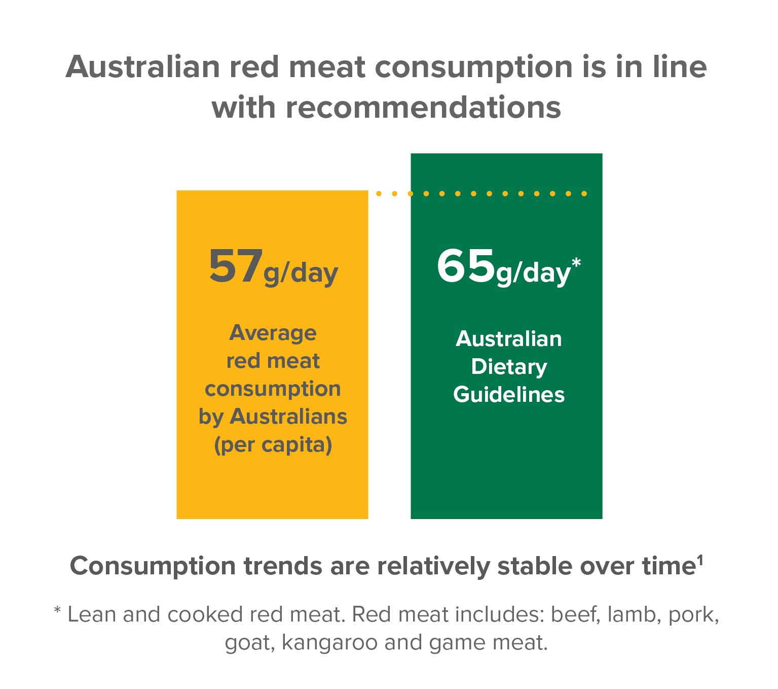 This is in line with Australian Dietary Guidelines which recommend 65g of lean and cooked red meat per day for iron and zinc.